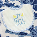 This popular sized bib is one of our best sellers! It has an easy hook and loop closure and is double-sided. The front is pique and the back thick, cotton terry. The thickness of our bibs keeps babies' clothes clean and the terry back can be used for wiping babies' mouths and any other feeding mishaps.