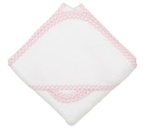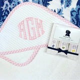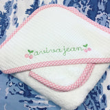 The hooded towel and washcloth is made of pure cotton terry cloth. Measuring 38x38, the towel is so large that it can last well into the toddler years. The washcloth measures 10x10 and is trimmed with a coordinating fabric.